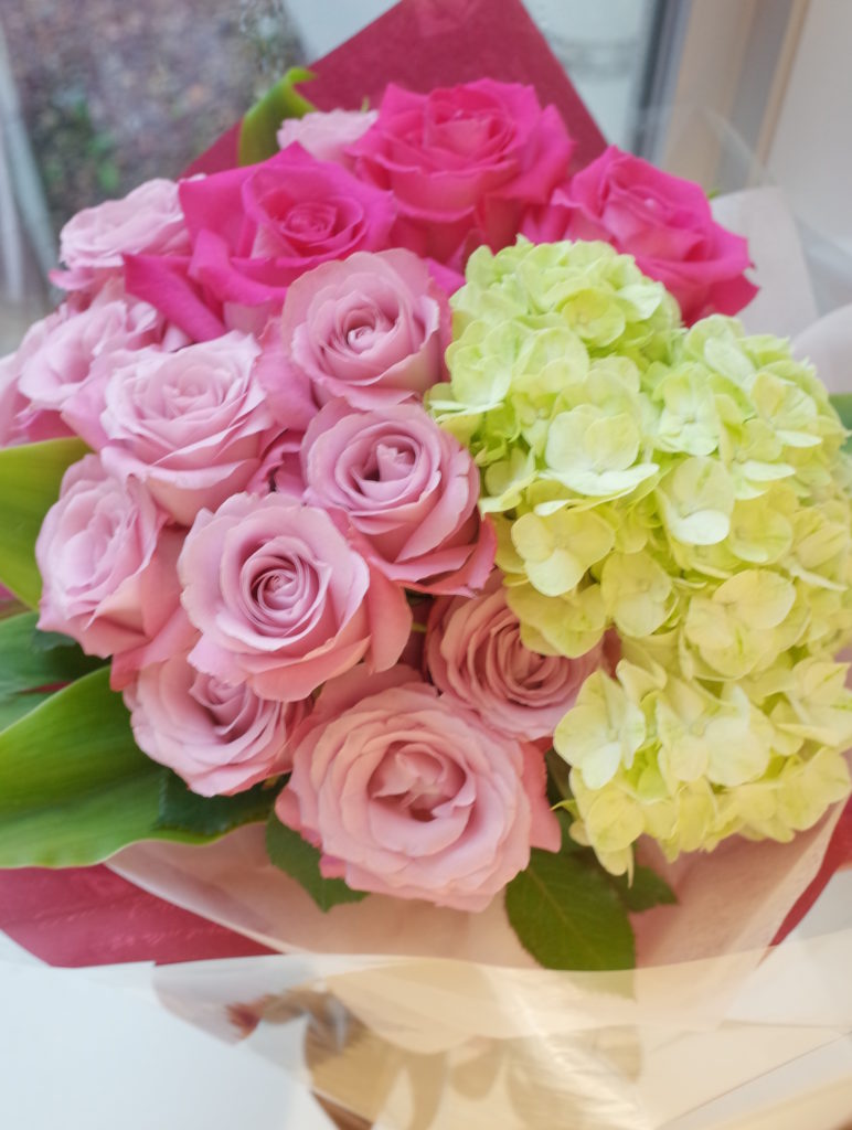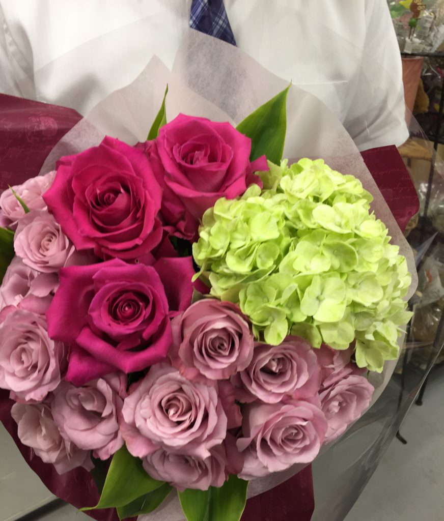 「LAWSONローソン」様より退職される女性へ。パープルのバラ「オキシジェン」、大輪バラ「リバイバル」、アジサイでボリューム感のあるブーケ。