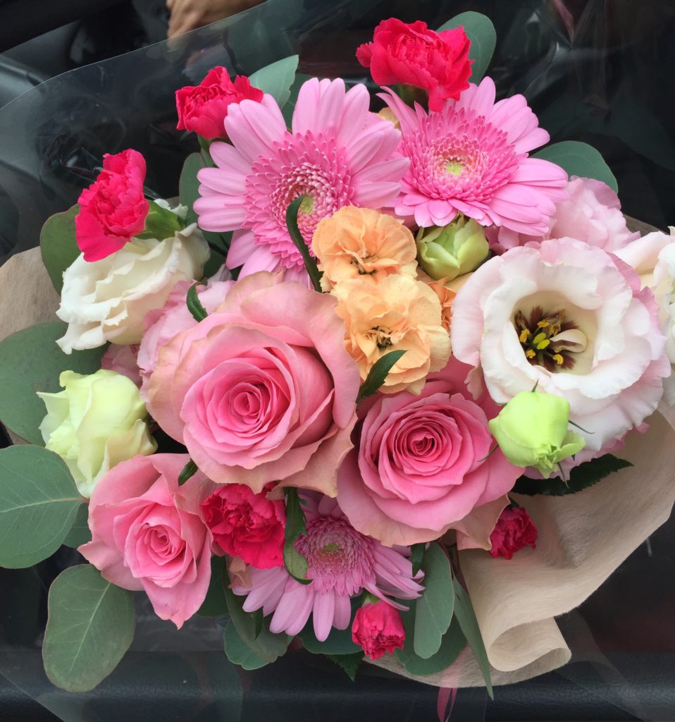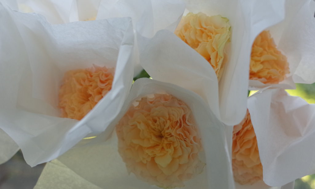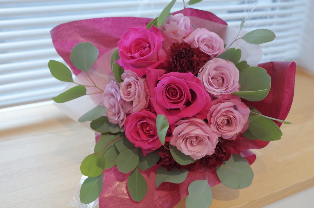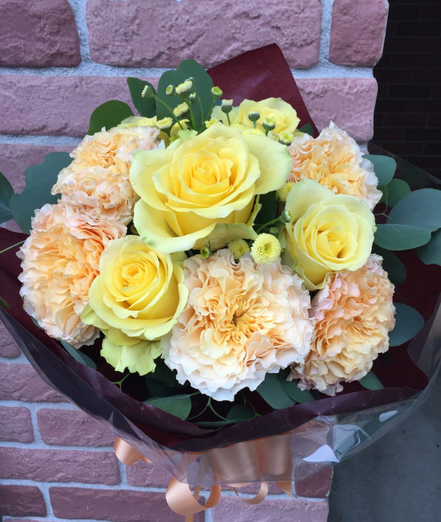 みなさま こんばんは。今日は9月末に送別用でお作りした花束をまとめてご紹介です。こちらは定年退職される男性へ可愛らしいイメージでとお任せいただき、ユーカリとマトリカリアのフレッシュな香りと共にバラの「ラ・カンパネラ」「ミニオン」で束ねました。