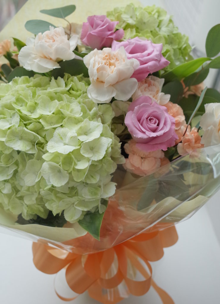 転勤される男性ドクターへ、爽やかなイメージでとお任せ頂きました。アジサイのライトグリーンとユーカリポポルスの香りで爽やかに。